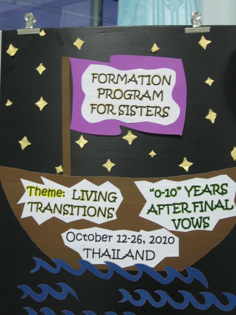 After three years in the drawing board, the continental gathering of sisters “0-10” years after final vows took place in Thailand on October 12-25, 2010. There were 19 participants in all: 6 Indians, 9 Filipinas, 3 Vietnamese, and 1 Mexican, who is a missionary in the Philippines. The team of formators who accompanied the group was composed of Sr. Mary Ann Azanza (US Province), Sr. Maria Christina Nakayama (Japan), Sr. Celine Mathew (India) and Sr. Marie Emmanuel Melocoton (General Councilor). The team who labored over the formulation and execution of the module was composed of Sr. Maria Rosa Medina and Sr. Deanna Maria Combong (both assigned in Thailand and served as hosts) with Sr. Mary Cecilia Claparols, Provincial Councilor, Philippine-Thailand Province, who was a missionary in Thailand for 18 years.